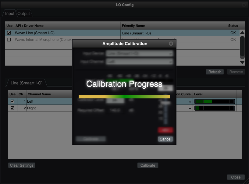- Once Smaart has fully calculated and the progress bar is at 100%, select OK to close the window. Smaart is now calibrated for SPL! You should see a calibration offset value in the Offset field of the amplitude calibration window and in the Cal. Offset field for that input.