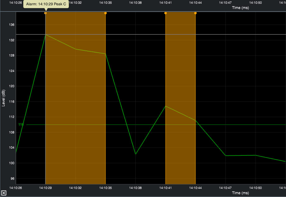 When logging, alarms are also recorded as events in the log file and flagged with a yellow lollipop marker on sound level history charts. Hovering over these lollipops will show the specific details of that specific event. A red lollipop, alternatively, indicates an input overload.